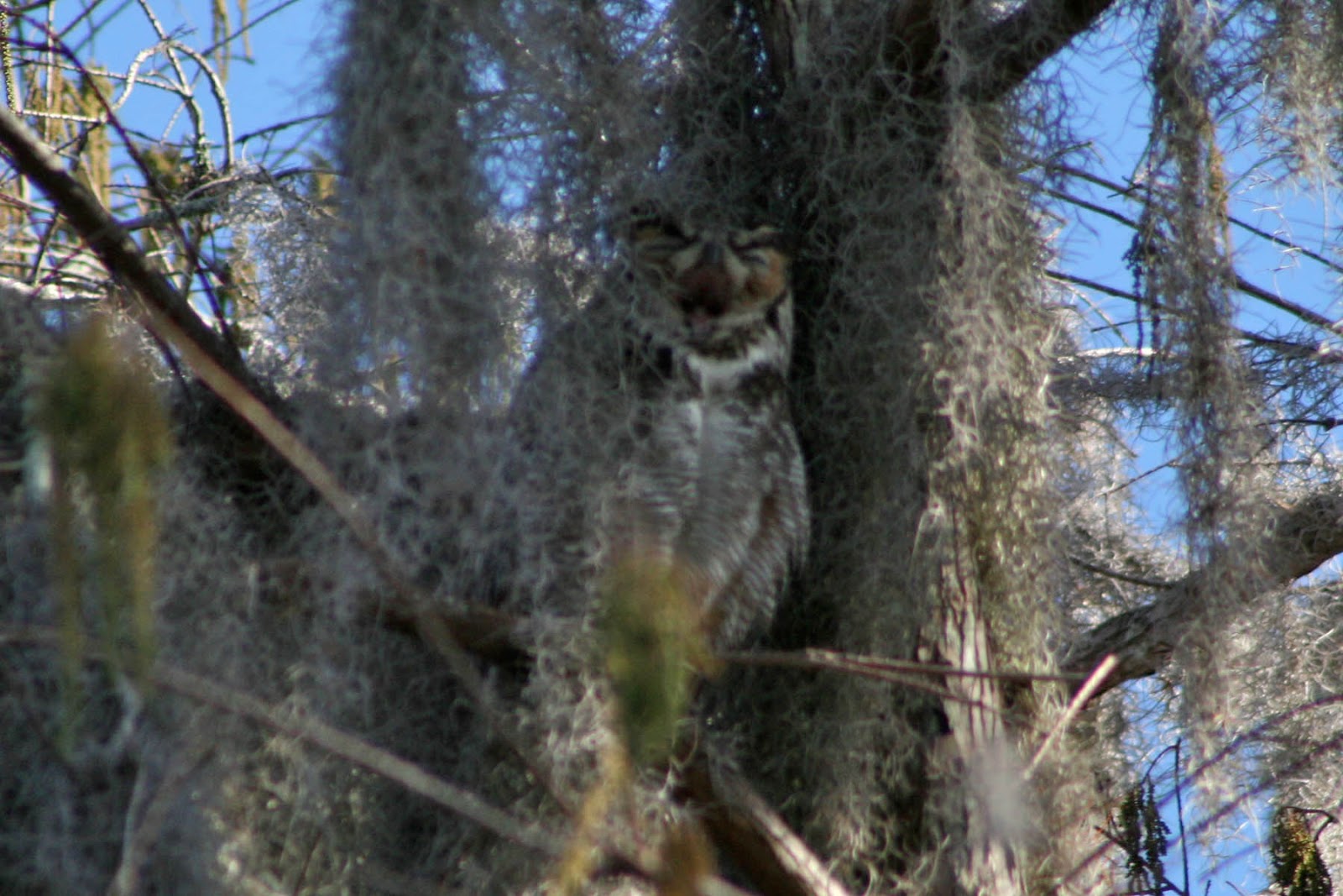 All this talk about the huge influx of Snowy Owls has left me with owl envy. So, to help with that, I’m reminiscing about the pair of Great Horned Owls and their chicks that we were very fortunate to see in early 2010 at the Loxahatchee National Wildlife Refuge in Boynton Beach, FL. In late February, a local birder pointed us in the direction of a pair of nesting Great Horned Owls. And thank goodness she practically held our hand to the exact spot because otherwise we probably would have NEVER found them on our own. Their mottled colors of grey, black, white and orangey-brown allowed them to camouflage so well with the tall trees and moss.
